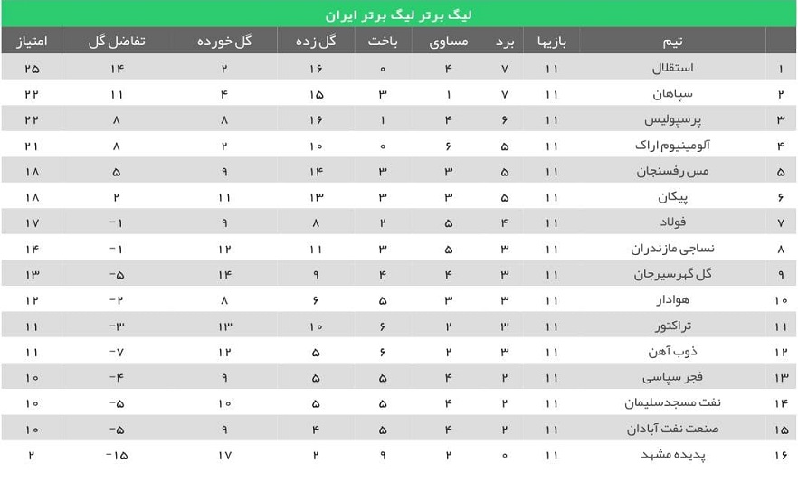 نتایج کامل دیدارهای هفته یازدهم لیگ برتر به شرح زیر است